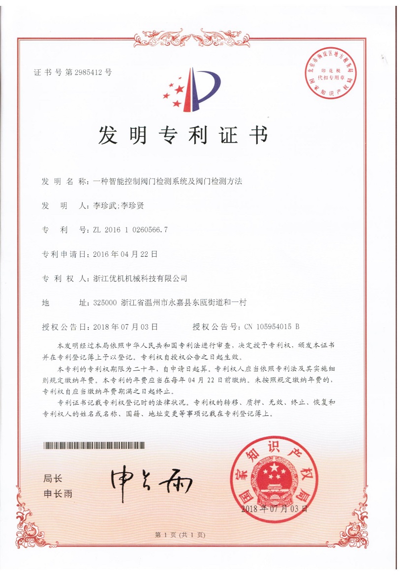 今年4月浙江優(yōu)機機械科技有限公司《一種閥門檢測設備》發(fā)明專利,獲得國家知識產(chǎn)權(quán)局授權(quán)。捷報連連該公司16年申請的一種智能控制閥門檢測系統(tǒng)及檢測方法已在2018年7月03日授權(quán)公告,公告號:CN105954015B發(fā)明專利號:ZL 2016 1 0260566.7