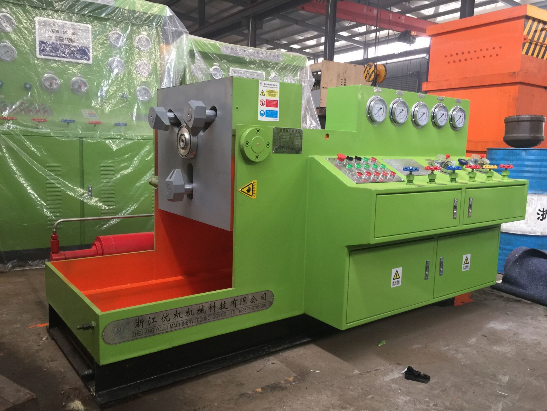 該系列控制閥壓力試驗(yàn)設(shè)備主要由液壓系統(tǒng)、機(jī)械系統(tǒng)、電氣系統(tǒng)和管路系統(tǒng)組成,能在較大的控制閥公稱尺寸范圍和較大的公稱壓力范圍內(nèi),在控制閥閥體不受任何附加外力的情況下,分別對(duì)控制閥進(jìn)行殼體和密封試驗(yàn)。