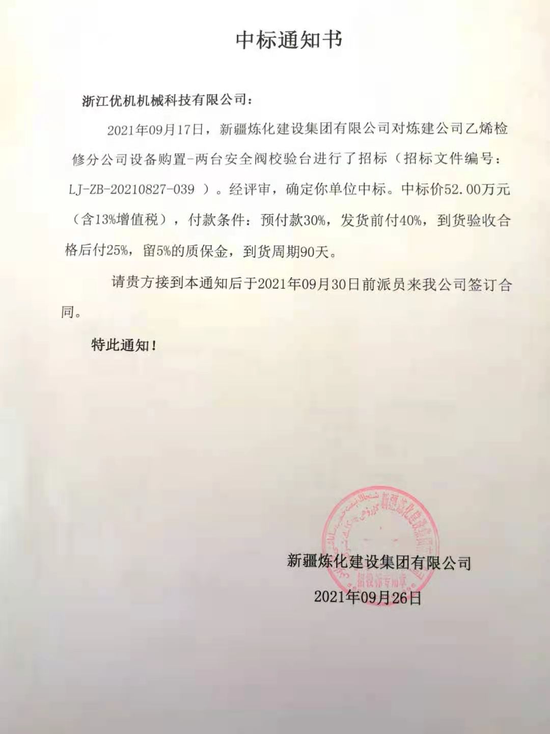 近期,新疆煉化建設(shè)集團(tuán)有限公司發(fā)出中標(biāo)通知書,宣布通知浙江優(yōu)機(jī)機(jī)械科技有限公司,二次添加設(shè)備購置項目-兩套安全閥校驗臺,經(jīng)評審確定中標(biāo)(招標(biāo)文件編號:LJ-ZB-20210827-039),合計一期和二期閥門檢測校驗設(shè)備總數(shù)達(dá)到11臺(套)金額貳佰多萬,該項目是浙江優(yōu)機(jī)機(jī)械科技有限公司主營產(chǎn)品進(jìn)入中石油樣本項目。